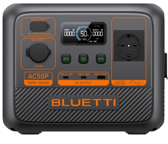 De BLUETTI AC50P is een compacte maar krachtige portable powerstation oplossing met een batterijcapaciteit van 504 Wh en een constant vermogen van 700 W, met een piekvermogen dat oploopt tot 1.200 W.
